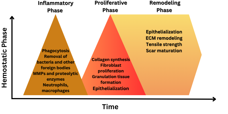 The wound healing process consists of four phases: hemostatic; inflammatory; proliferative; and remodeling. In combination with proper wound care products, our body’s systems work together throughout these four phases to repair and replace devitalized tissue.